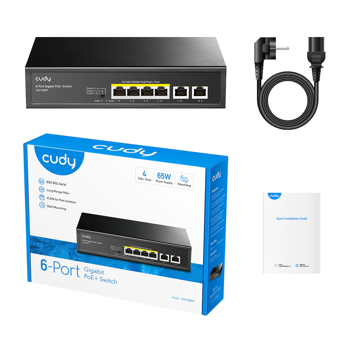 6-Port Gigabit PoE Switch - A rack-mounted 6-GbE PoE switch with a 65W power supply and a silent cooling system - 4× GbE with 802.3at/af Mode A PoE - 2× Uplink GbE